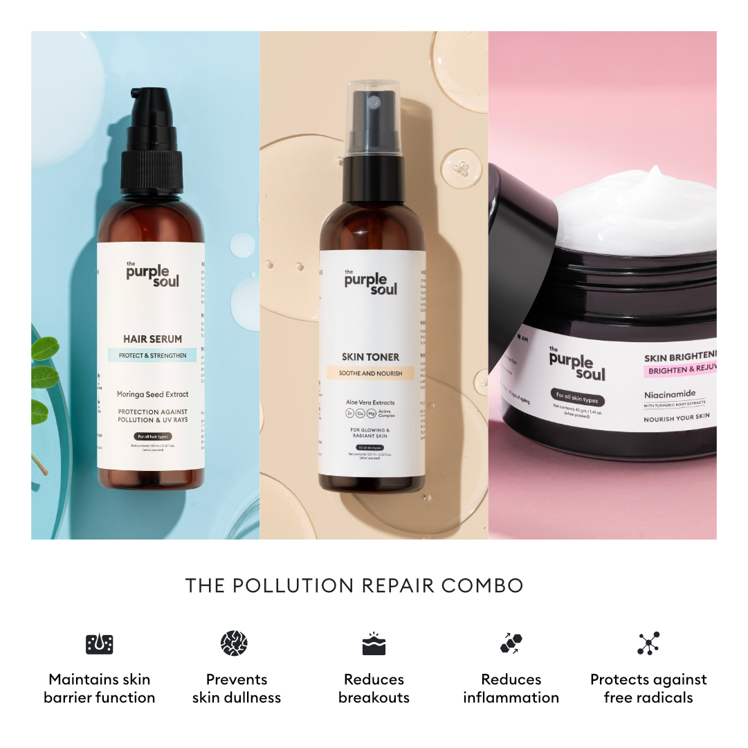 Defend against everyday pollution with The Purple Soul Pollution Repair Combo. This specially formulated combo with scientifically proven ingredients is designed to revitalize your skincare routine, keeping your skin healthy and radiant.