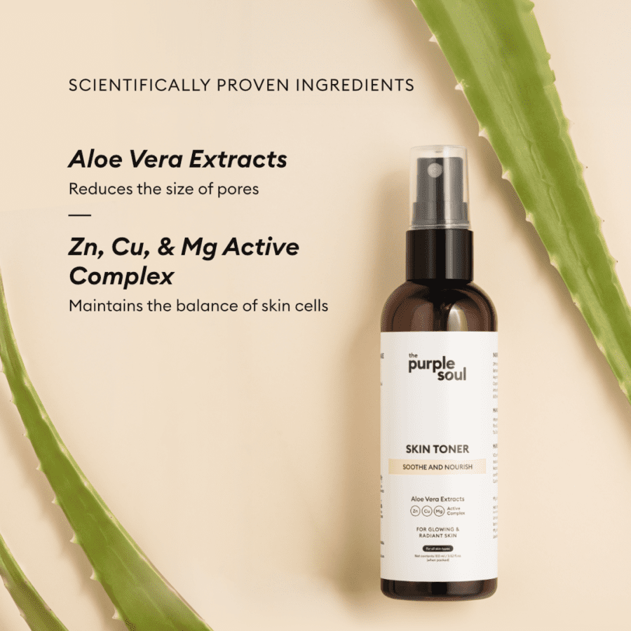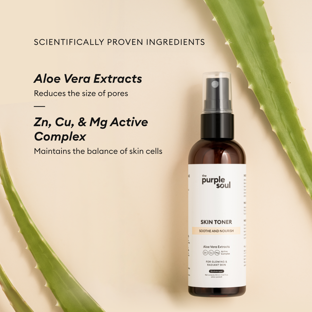 - Skin Toner – Aloe Vera soothes, hydrates & minimizes pores for a refined, glossy complexion. Zinc, Magnesium & Copper balance & revitalize for refreshed, toned skin.