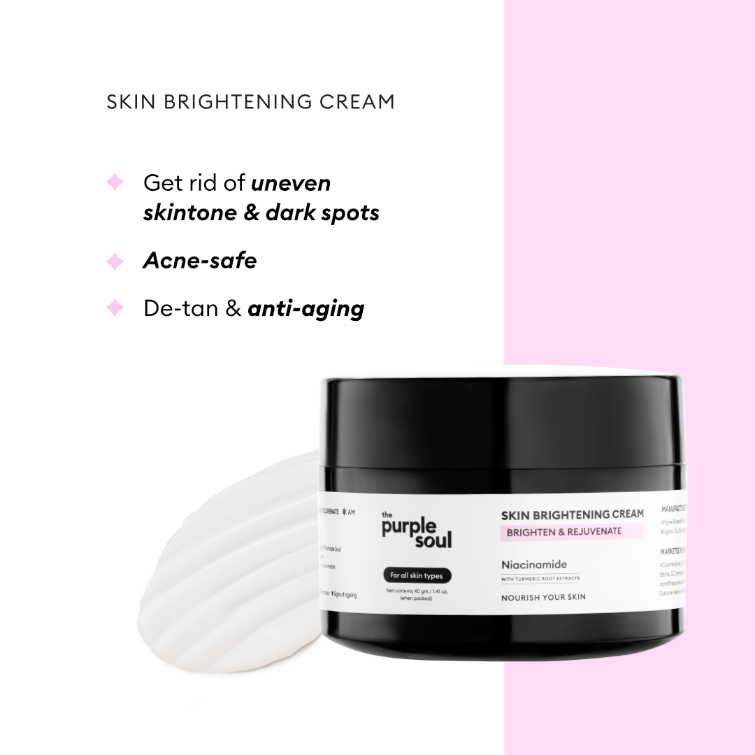 - Skin Brightening Cream – Curcumin brightens & calms skin, niacinamide strengthens for an even-toned look, radiant skin. Lock 24hr moisture.