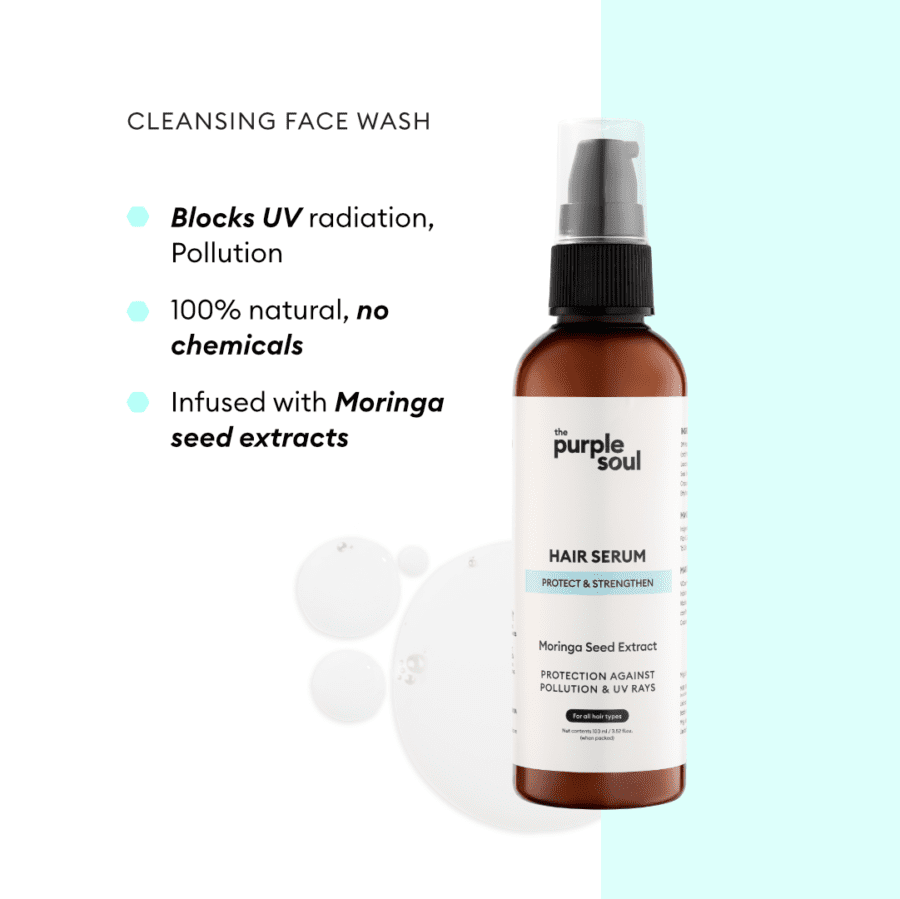- Hair Serum – Moringa seed serum shields hair from pollution & UV. Conditions, strengthens, & tames frizz for healthy shine.